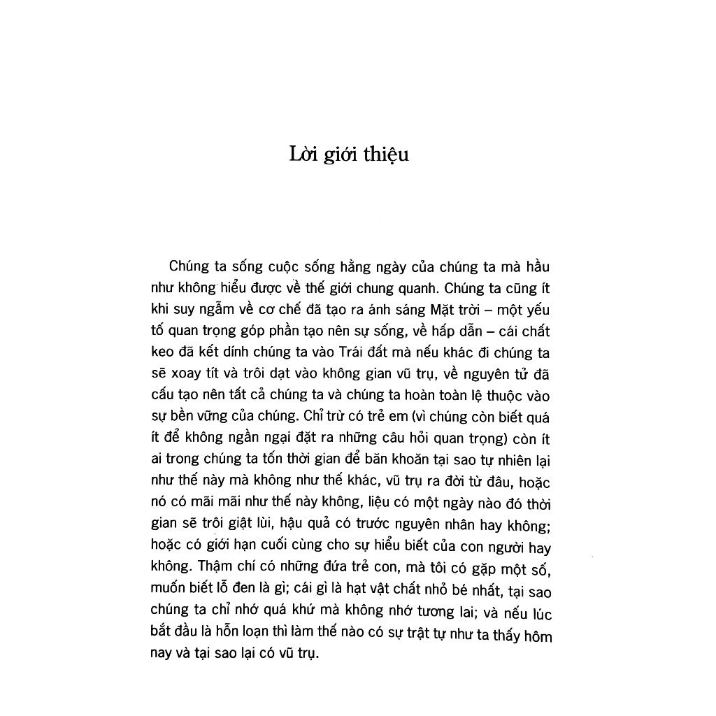 Chúng ta sống cuộc sống hàng ngày của chúng ta mà hầu như không hiểu được về thế giới chung quanh. Chúng ta cũng ít khi suy ngẫm về cơ chế đã tạo ra ánh sáng Mặt trời - một yếu tố quan trọng góp phần tạo nên sự sống, về hấp dẫn – cái chất keo đã kết dính chúng ta vào Trái đất mà nếu khác đi chúng ta sẽ xoay tít và trôi dạt vào không gian vũ trụ, về nguyên tử đã cấu tạo nên tất cả chúng ta và chúng ta hoàn toàn lệ thuộc vào sự bền vững của chúng. Chỉ trừ có trẻ em (vì chúng còn biết quá ít để không ngần ngại đặt ra những câu hỏi quan trọng) còn ít ai trong chúng ta tốn thời gian để băn khoăn tại sao tự nhiên lại như thế này mà không như thế khác, vũ trụ ra đời từ đâu, hoặc nó có mãi mãi như thế này không, liệu có một ngày nào đó thời gian sẽ trôi giật lùi, hậu quả có trước nguyên nhân hay không; hoặc có giới hạn cuối cùng cho sự hiểu biết của con người hay không. Thậm chí có những đứa trẻ con, mà tôi có gặp một số, muốn biết lỗ đen là cái gì; cái gì là hạt vật chất nhỏ bé nhất, tại sao chúng ta chỉ nhớ quá khứ mà không nhớ tương lai; và nếu lúc bắt đầu là hỗn loạn thì làm thế nào có sự trật tự như ta thấy hôm nay và tại sao lại có vũ trụ.
