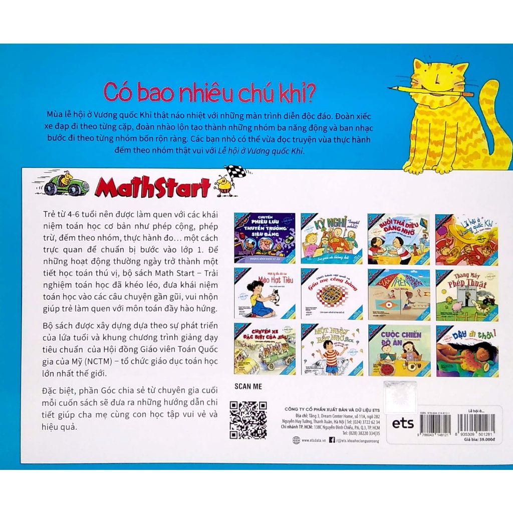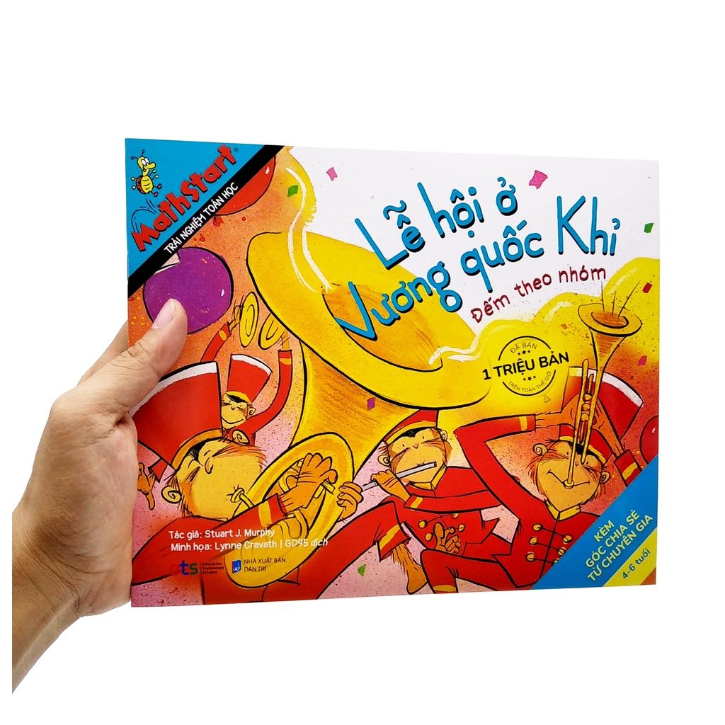 Đây là 1 cuốn trong bộ sách Math Start − Trải nghiệm toán học. Trẻ từ 4-6 tuổi nên được làm quen với các khái niệm toán học cơ bản như phép cộng, phép trừ, đếm theo nhóm, thực hành đo… một cách trực quan để chuẩn bị trước khi bước vào lớp 1. Để những hoạt động thường ngày trở thành một tiết học toán thú vị, Math Start − Trải nghiệm toán học đã khéo léo đưa toán học vào các câu chuyện gần gũi, vui nhộn giúp trẻ có bước làm quen với môn toán đầy hào hứng. Lễ hội ở Vương quốc khỉ Mùa lễ hội ở Vương quốc khỉ thật náo nhiệt với những màn trình diễn độc đáo. Đoàn xiếc xe đạp đi theo từng cặp, đoàn nhào lộn tạo thành những nhóm 3 năng động và ban nhạc bước đi theo từng nhóm 4 rộn ràng. Các bạn nhỏ có thể vừa đọc truyện vùa thực hành đếm theo nhóm thật vui với Lễ hội ở Vương quốc khỉ. Thông tin chi tiết: Sách - Ma trải nghiệm toán học: Lễ hội ở vương quốc khỉ Công ty phát hành: Alpha books Nhà xuất bản: NXB Dân Trí Tác giả: Stuart J Murphy Quy cách: Bìa mềm Kích thước (cm): 25 x 20.7 Số trang: 36 Năm Xuất Bản: 2021